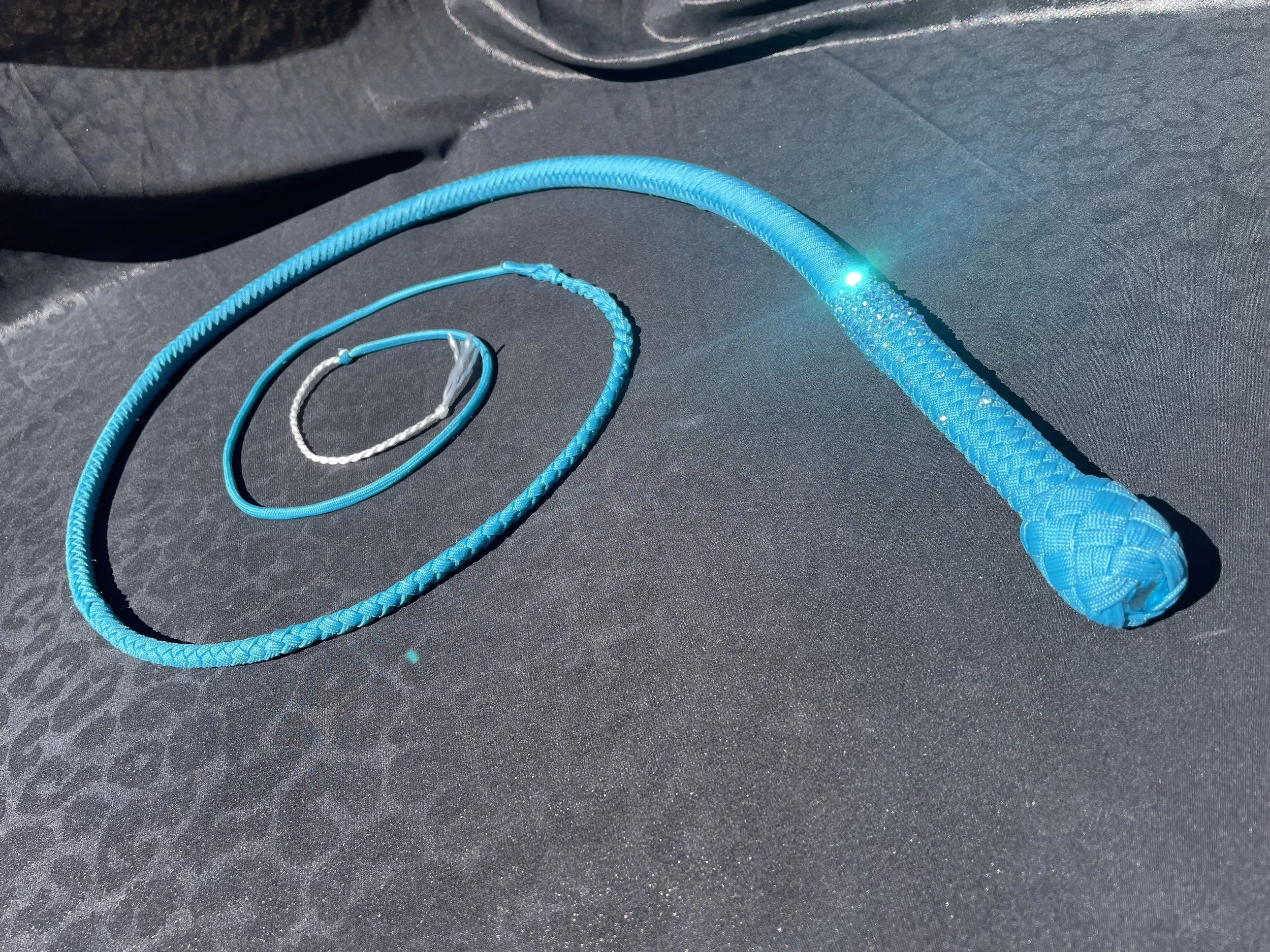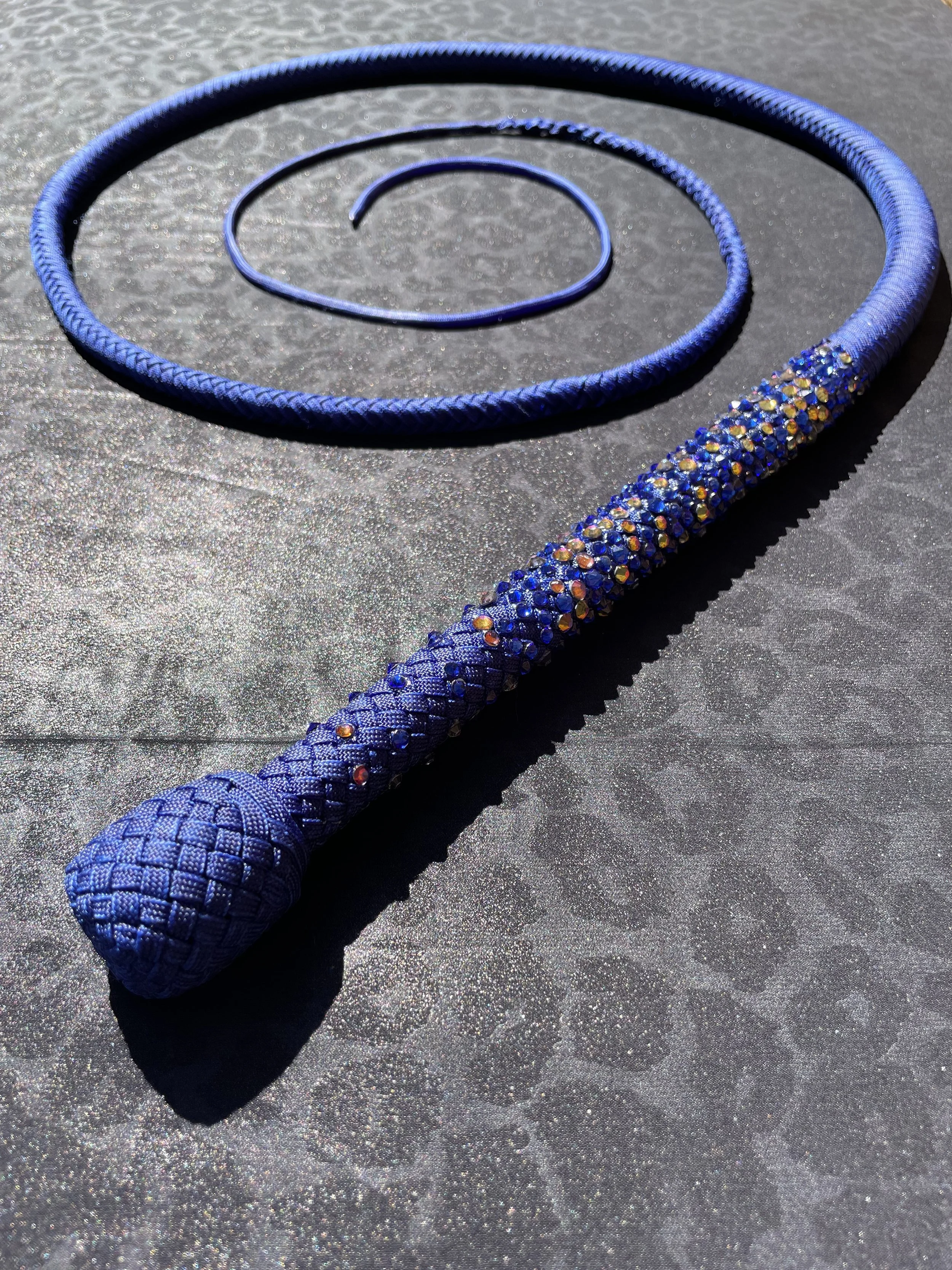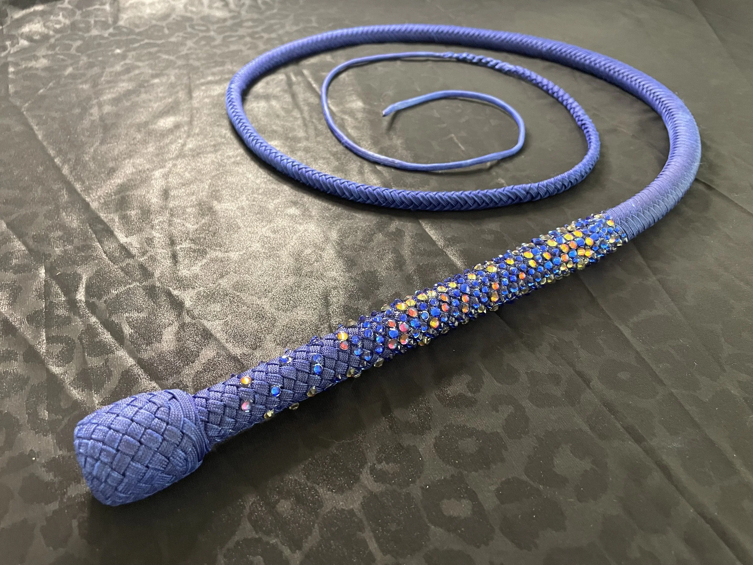 As the newest addition to the Sin City Kitty Designs collection, the Stardust whip begins as a classic or ombre’ overlay and is finished off with high quality gemstones carefully curated by the Las Vegas local artisans at Looking Glass Gems. These whips were designed to sparkle with the luster that Vegas is famous for. As a performer myself, I created these whips to light up the stage and dazzle audiences.