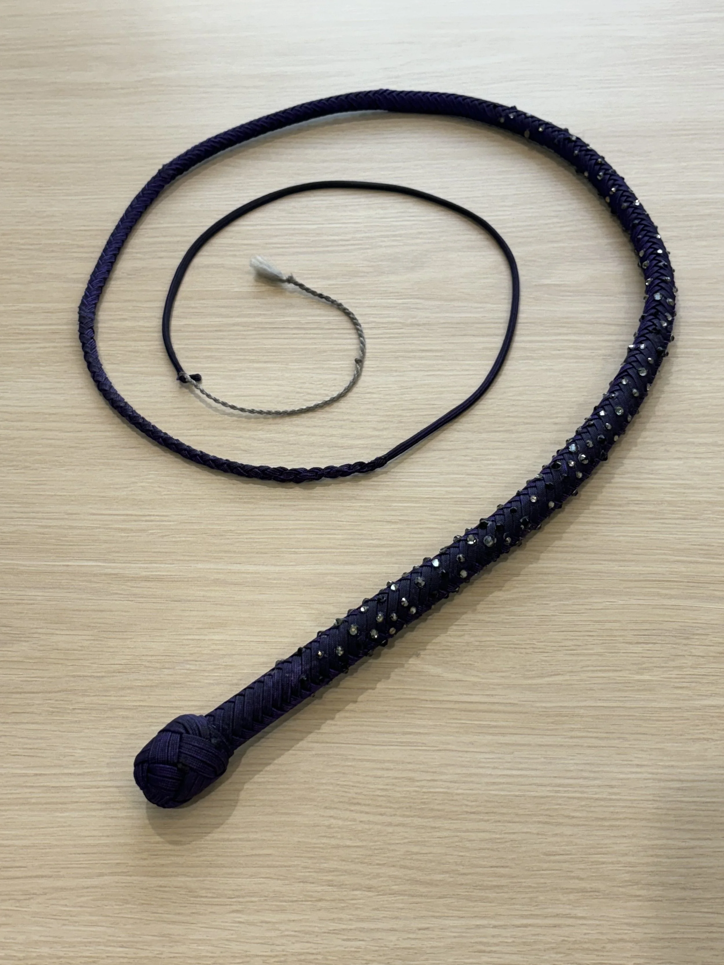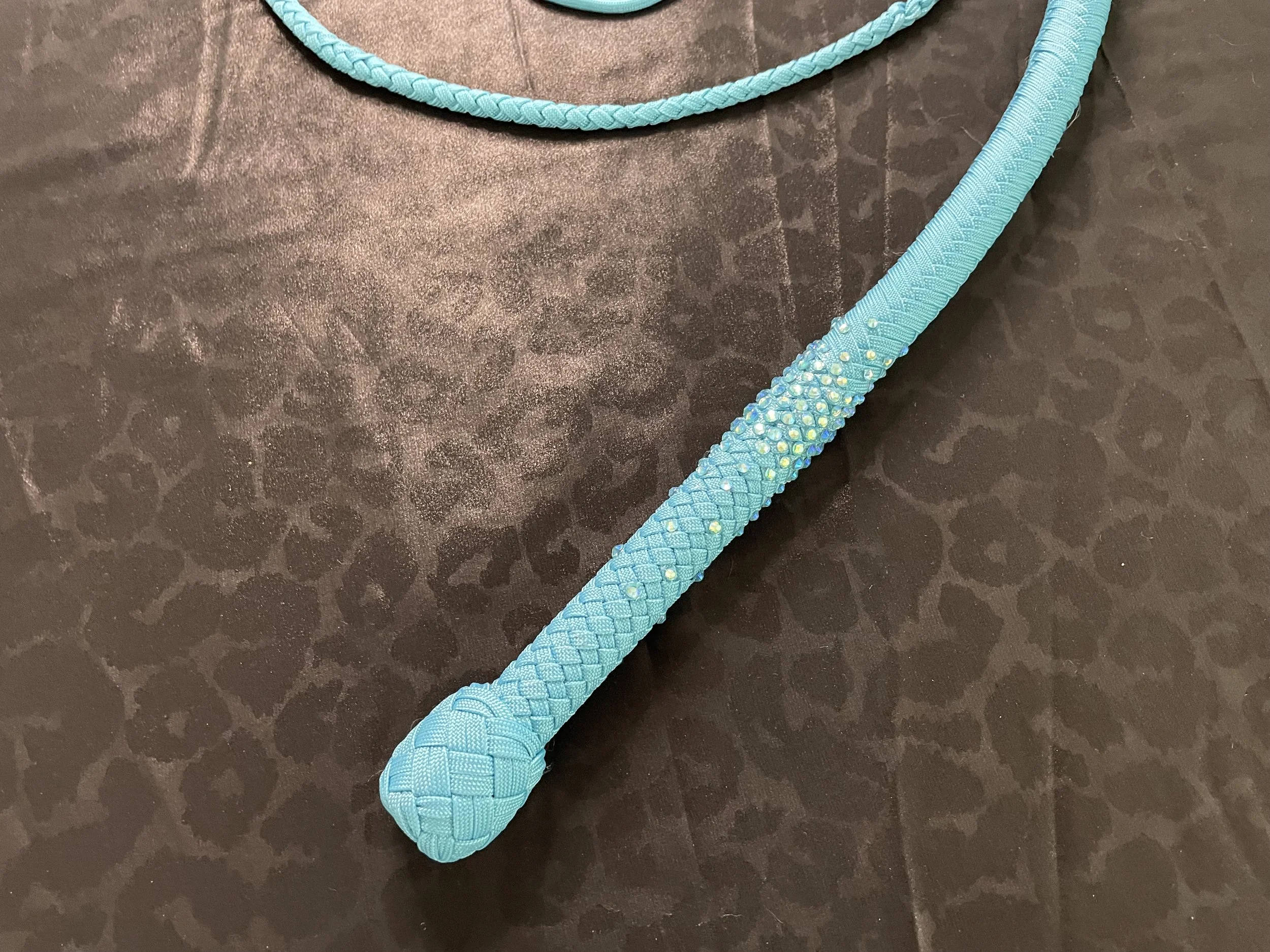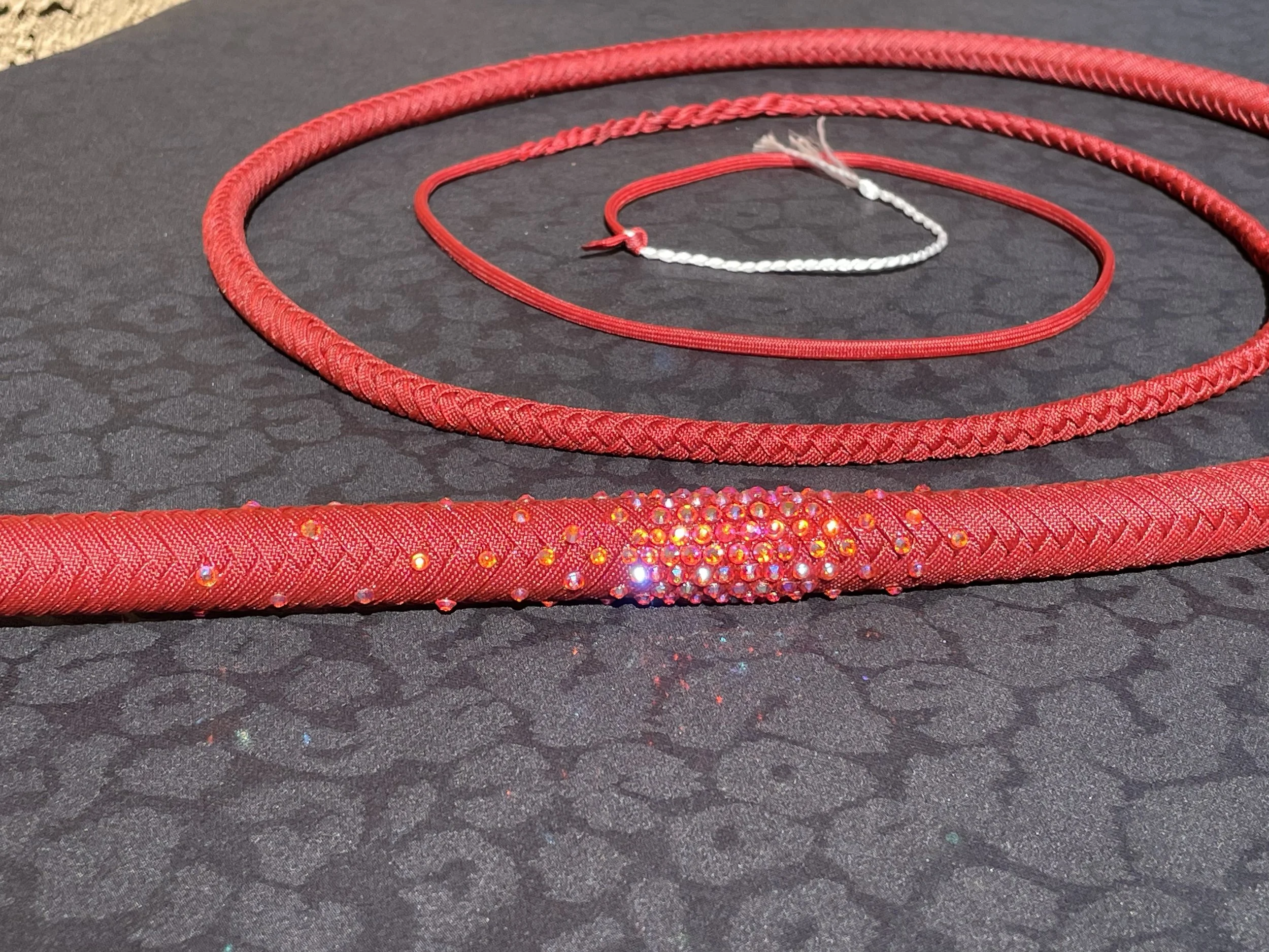 As the newest addition to the Sin City Kitty Designs collection, the Stardust whip begins as a classic or ombre’ overlay and is finished off with high quality gemstones carefully curated by the Las Vegas local artisans at Looking Glass Gems. These whips were designed to sparkle with the luster that Vegas is famous for. As a performer myself, I created these whips to light up the stage and dazzle audiences.