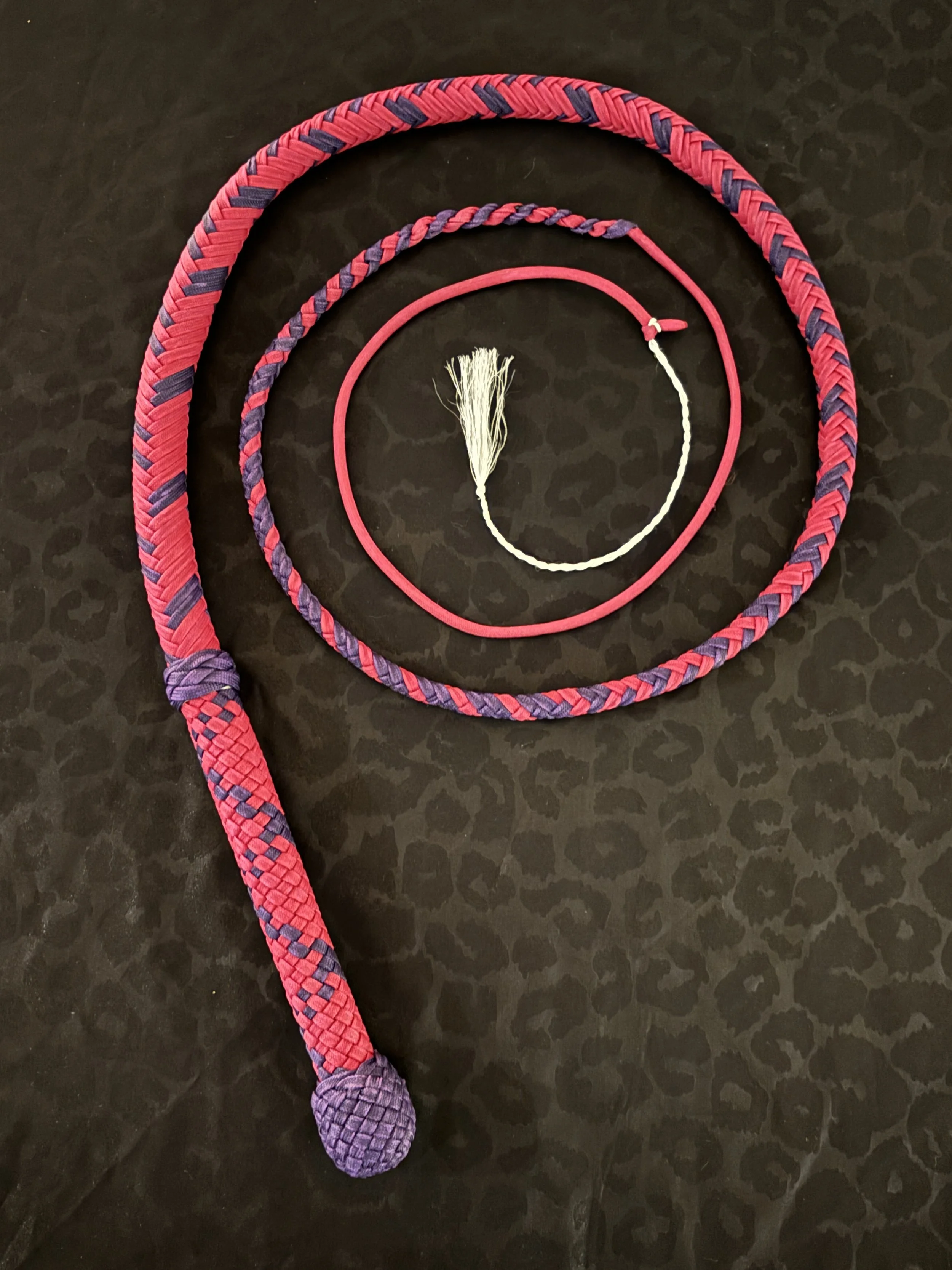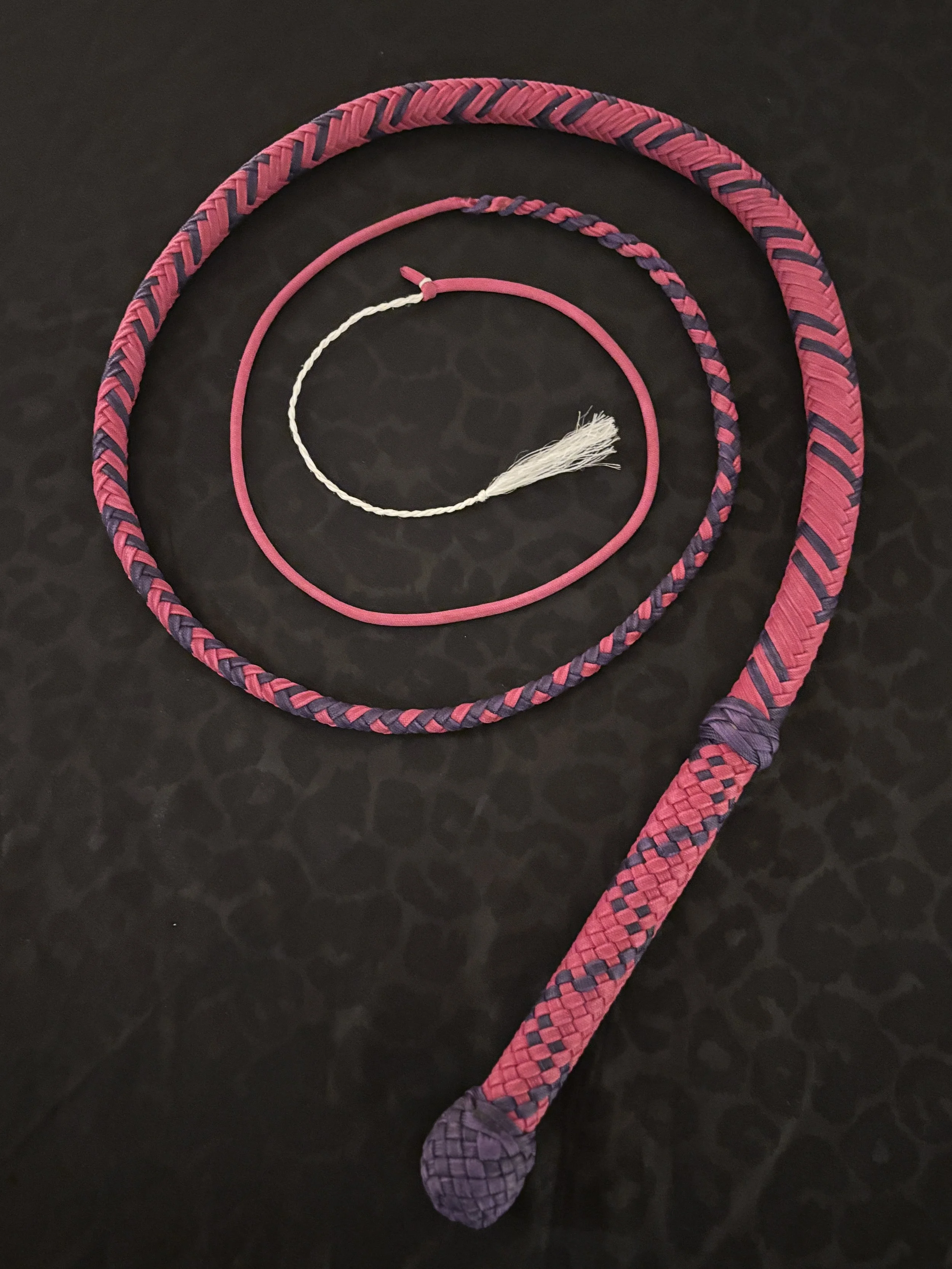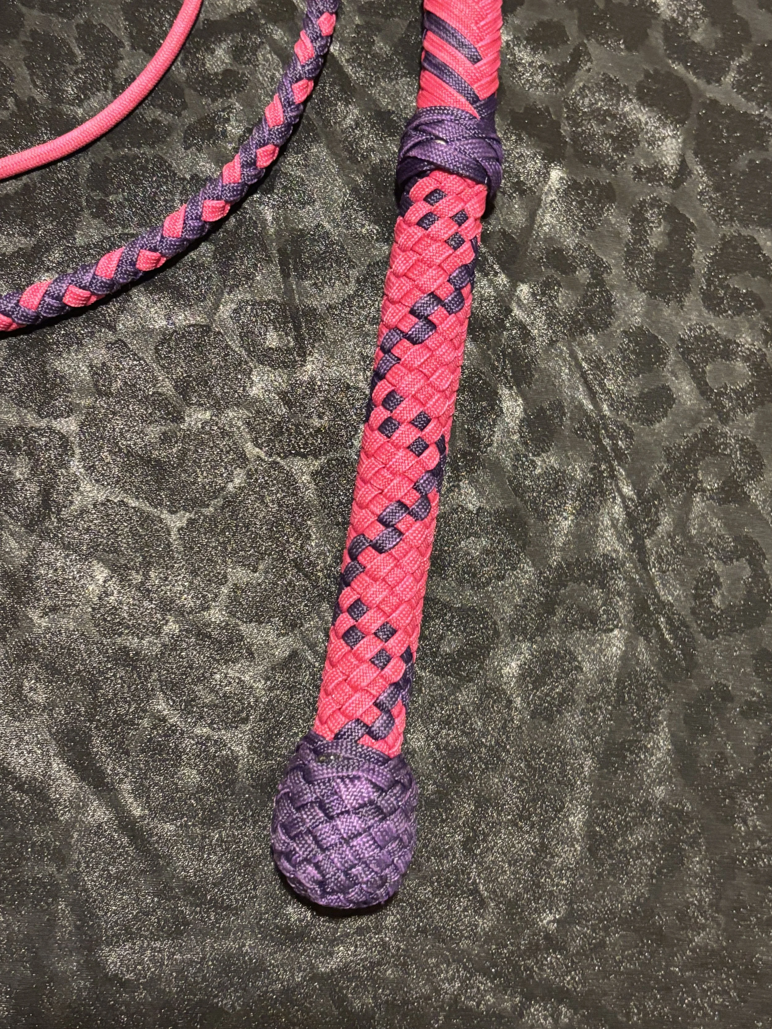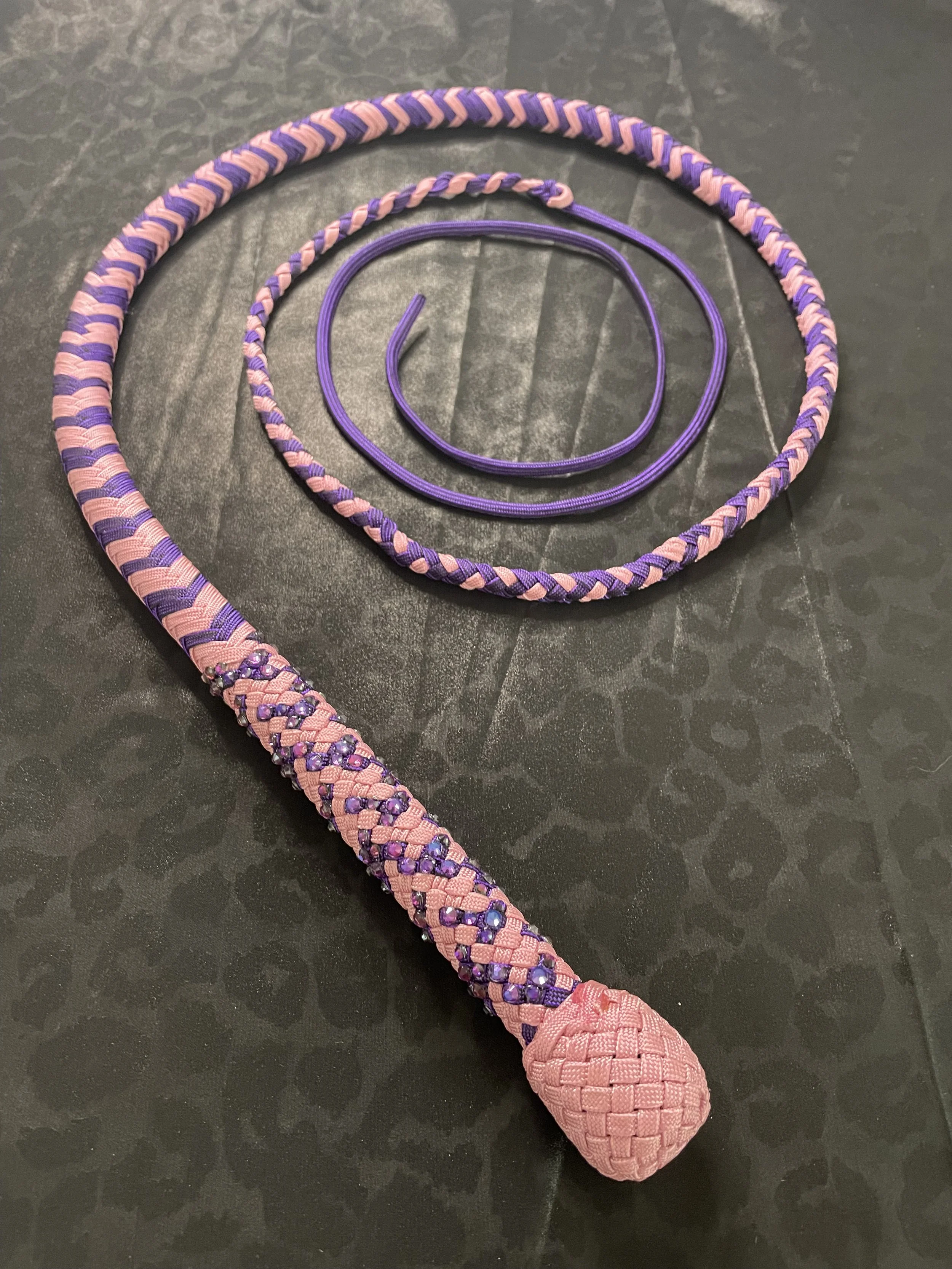 The Ombre’ style bullwhip is a custom design I've developed that features a smooth, gradual fade between colors that starts in the handle and continues along the length of the whip. The color transition can range from subtle to bold, depending on the desired aesthetic, making every Ombre’ whip a one-of-a-kind, functional work of art. A signature of the Sin City Kitty Style, this design is easily recognizable and well-regarded within the whip enthusiast community.