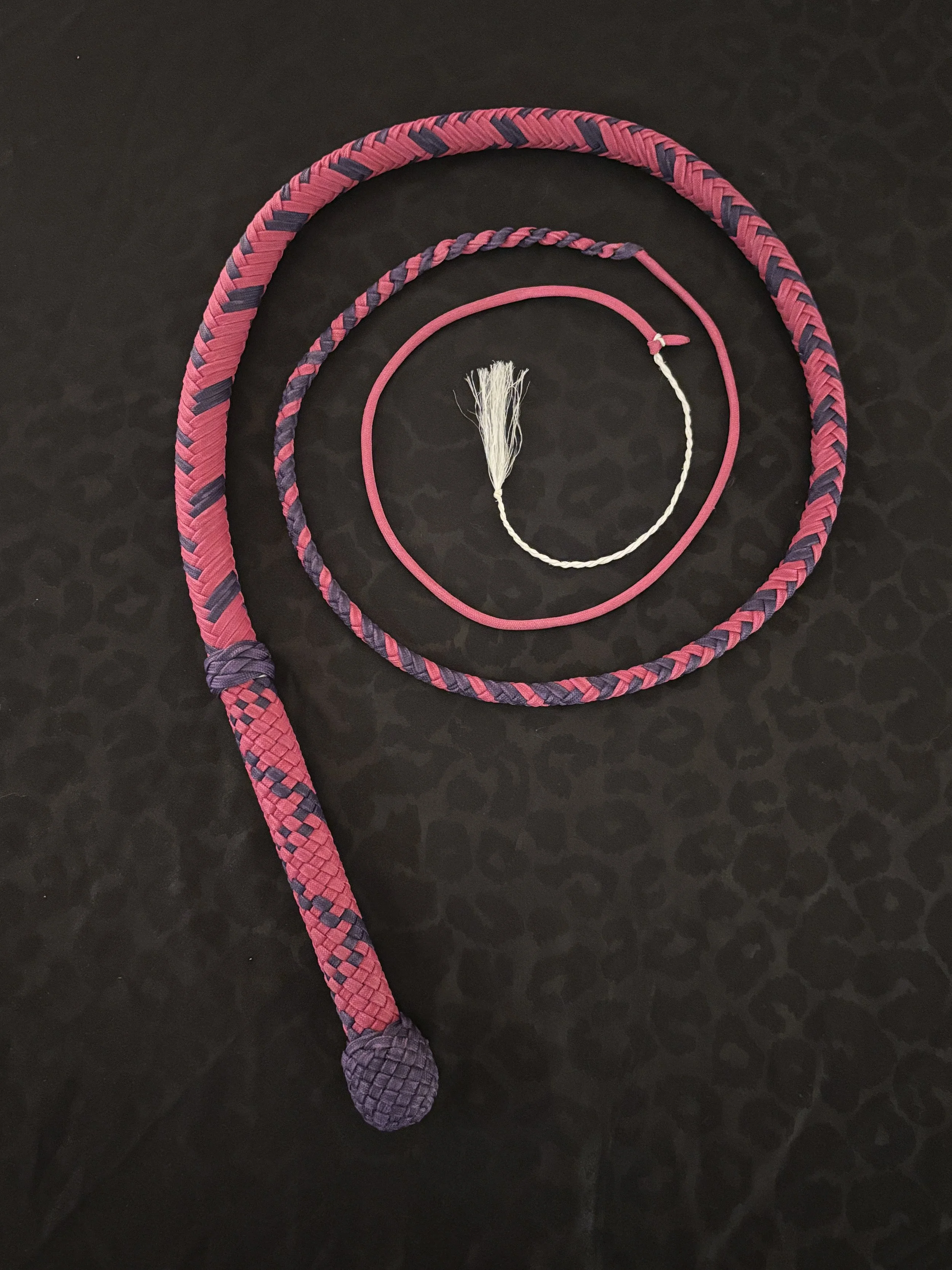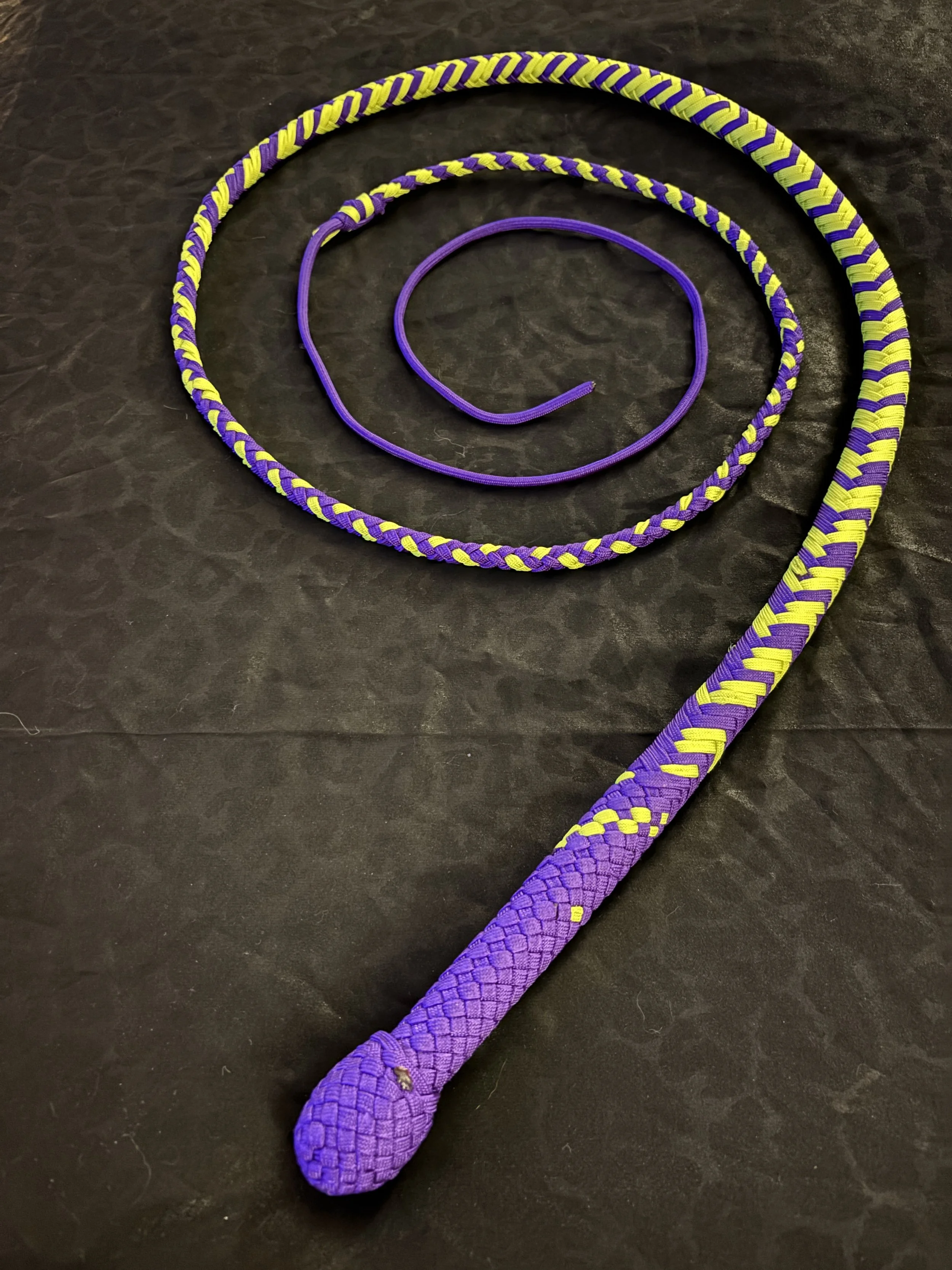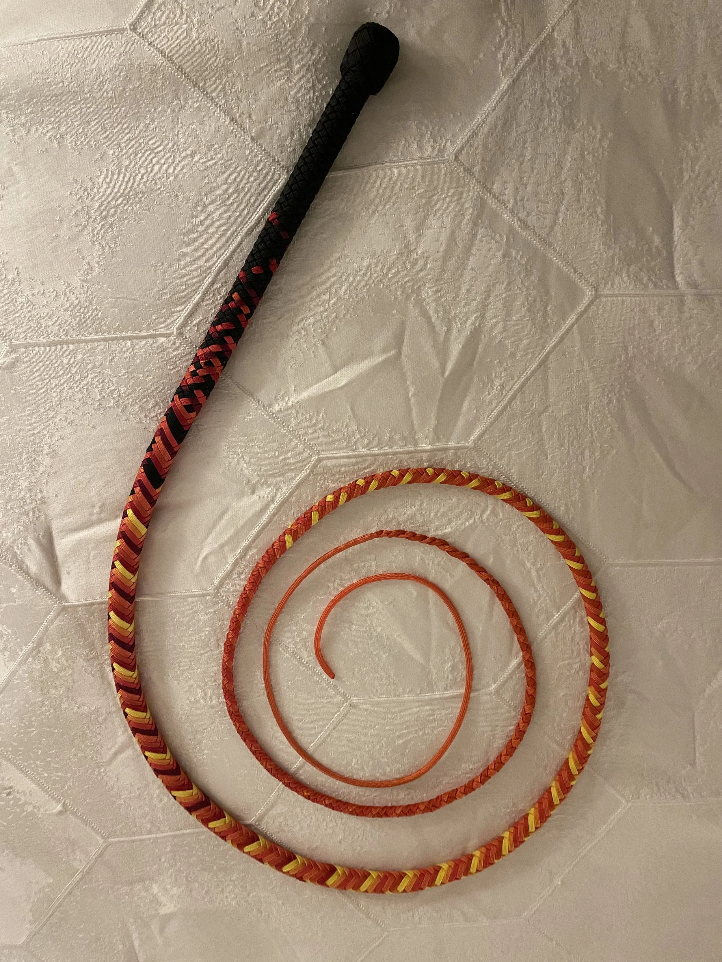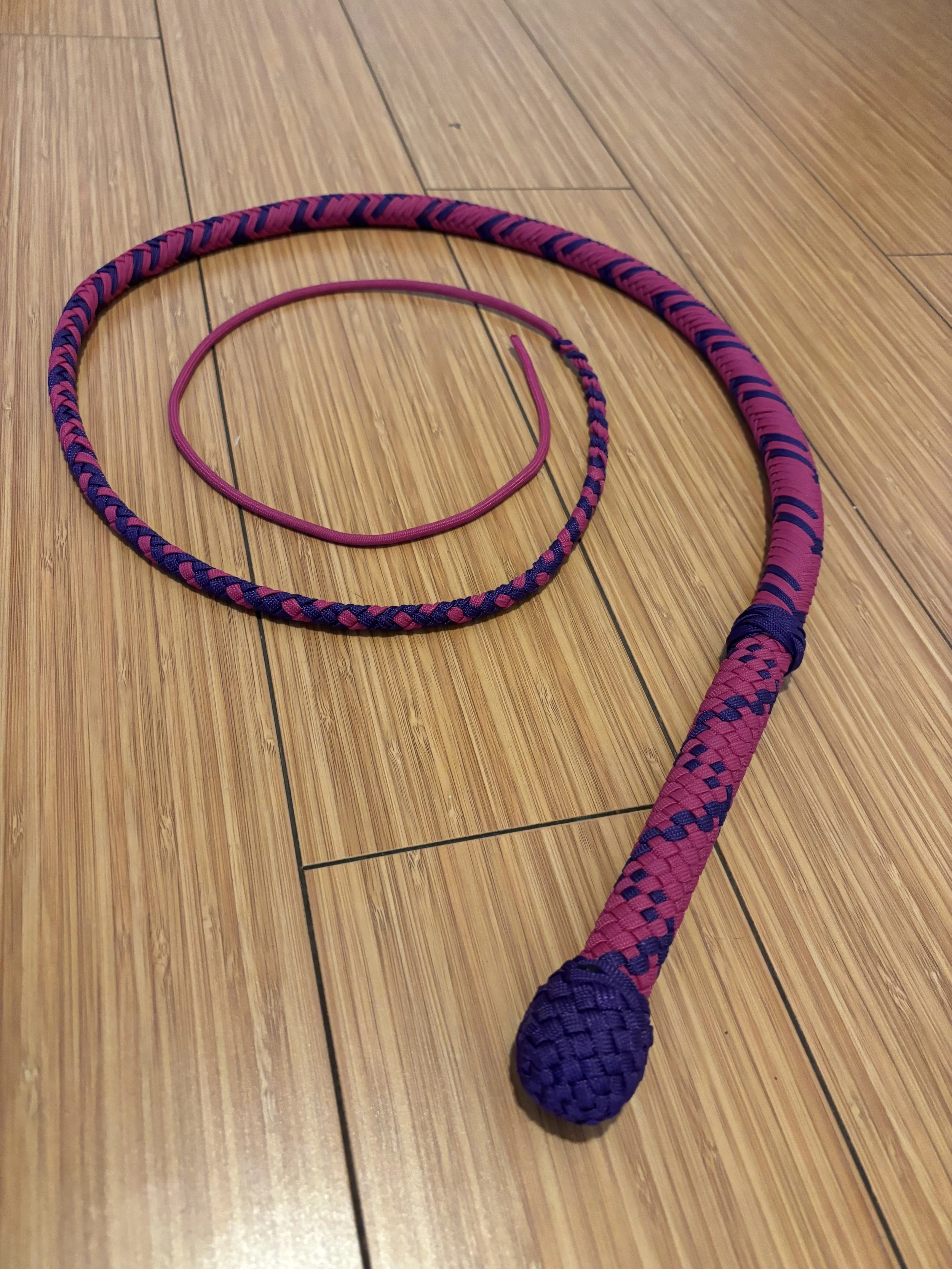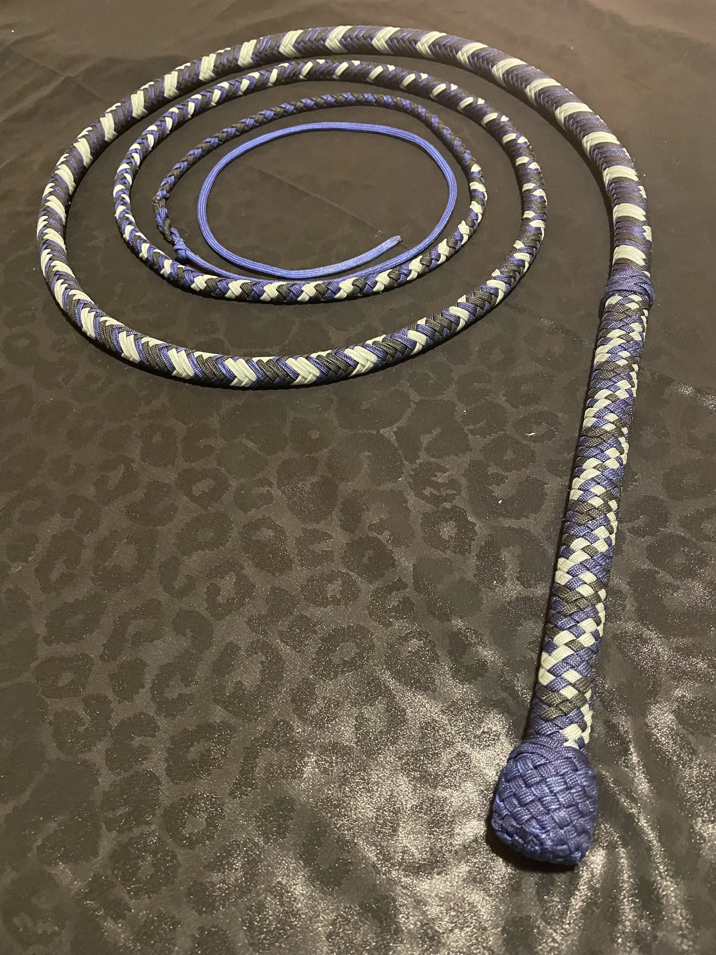The Ombre’ style bullwhip is a custom design I've developed that features a smooth, gradual fade between colors that starts in the handle and continues along the length of the whip. The color transition can range from subtle to bold, depending on the desired aesthetic, making every Ombre’ whip a one-of-a-kind, functional work of art. A signature of the Sin City Kitty Style, this design is easily recognizable and well-regarded within the whip enthusiast community.