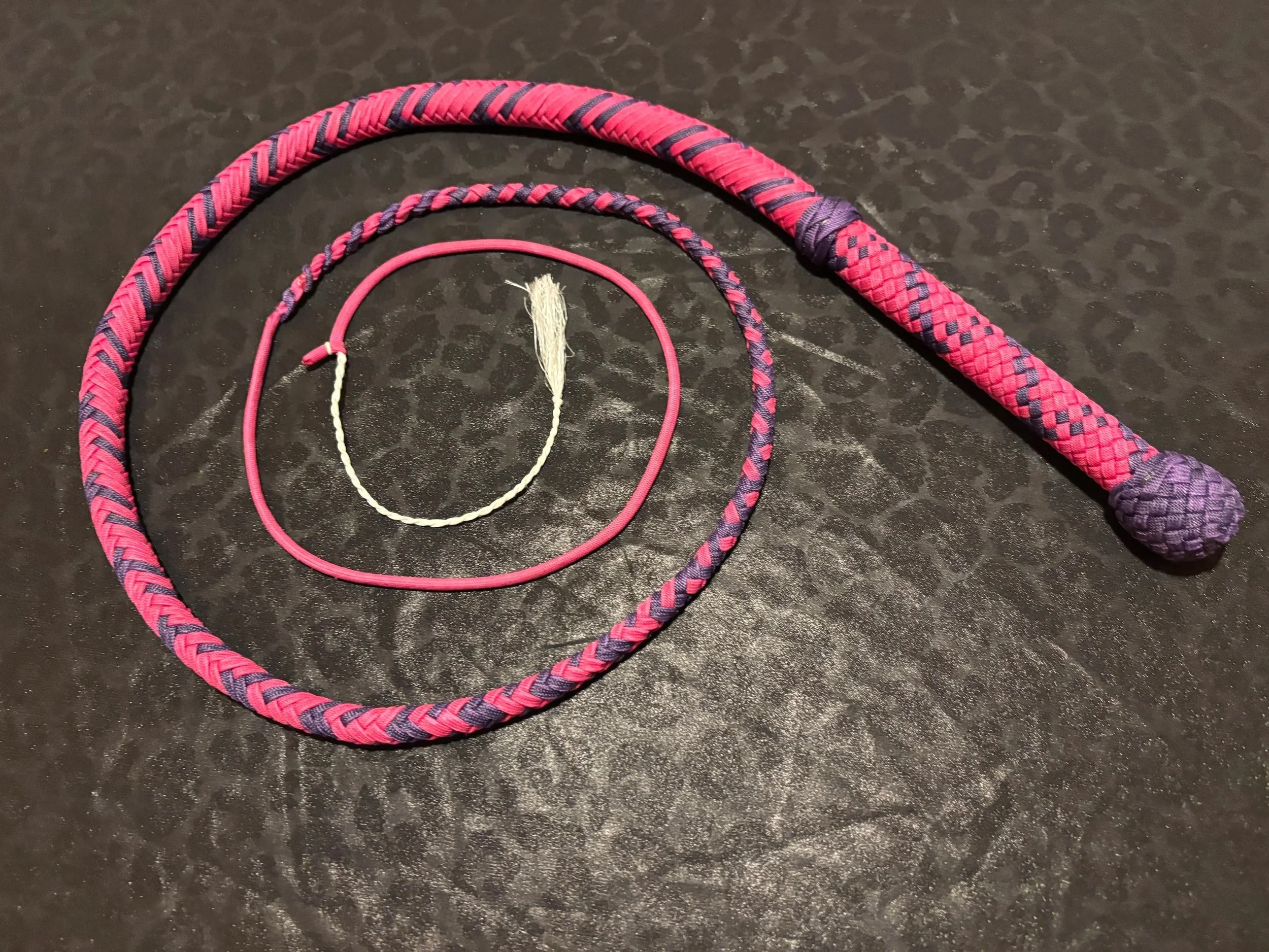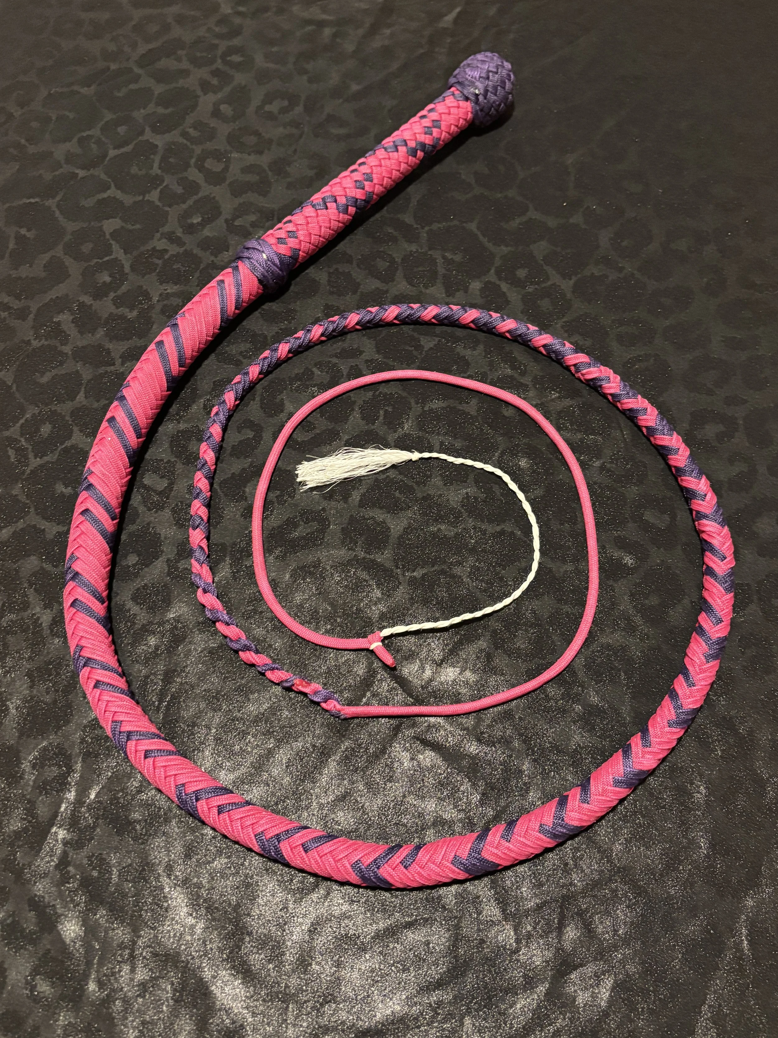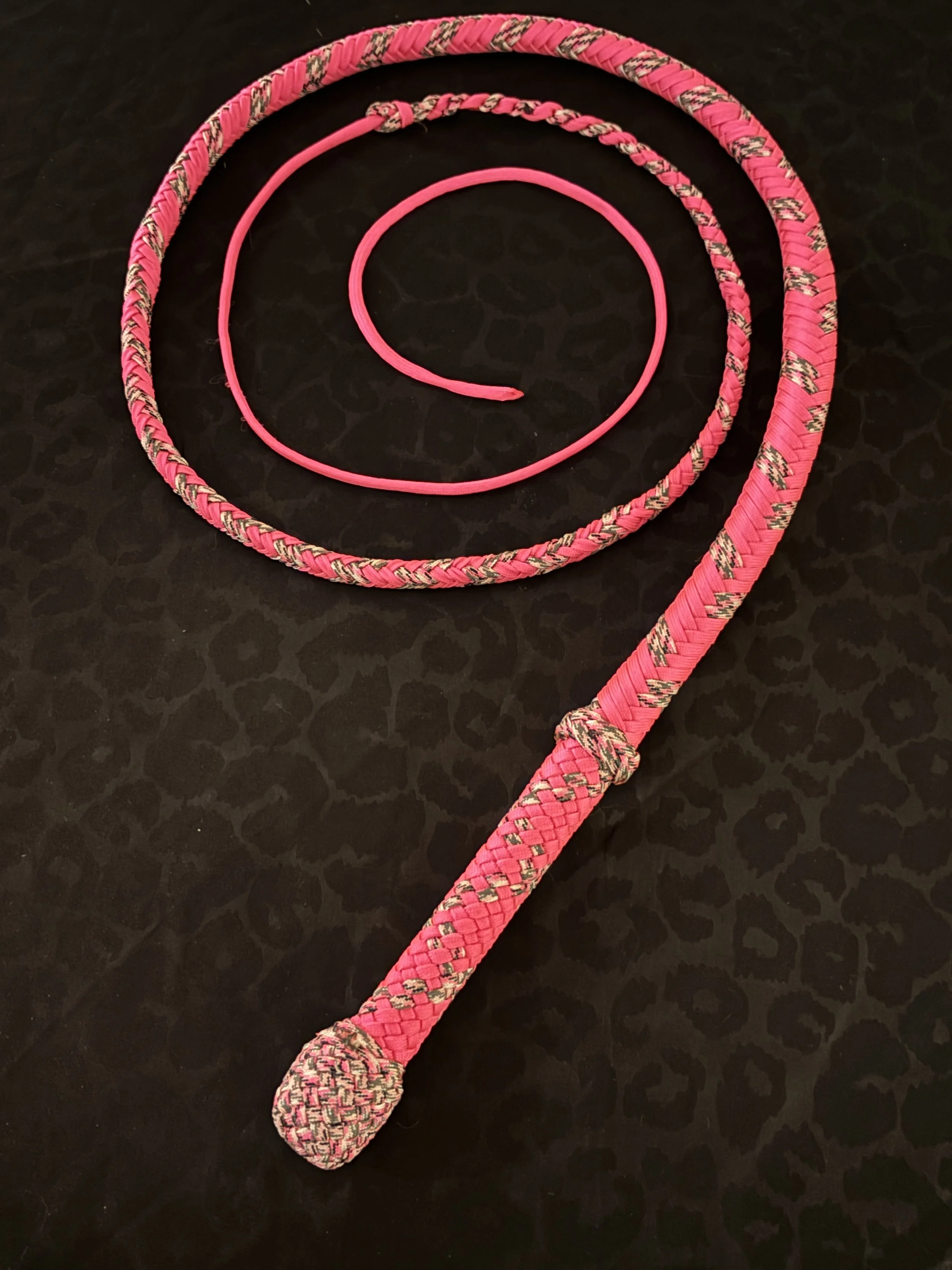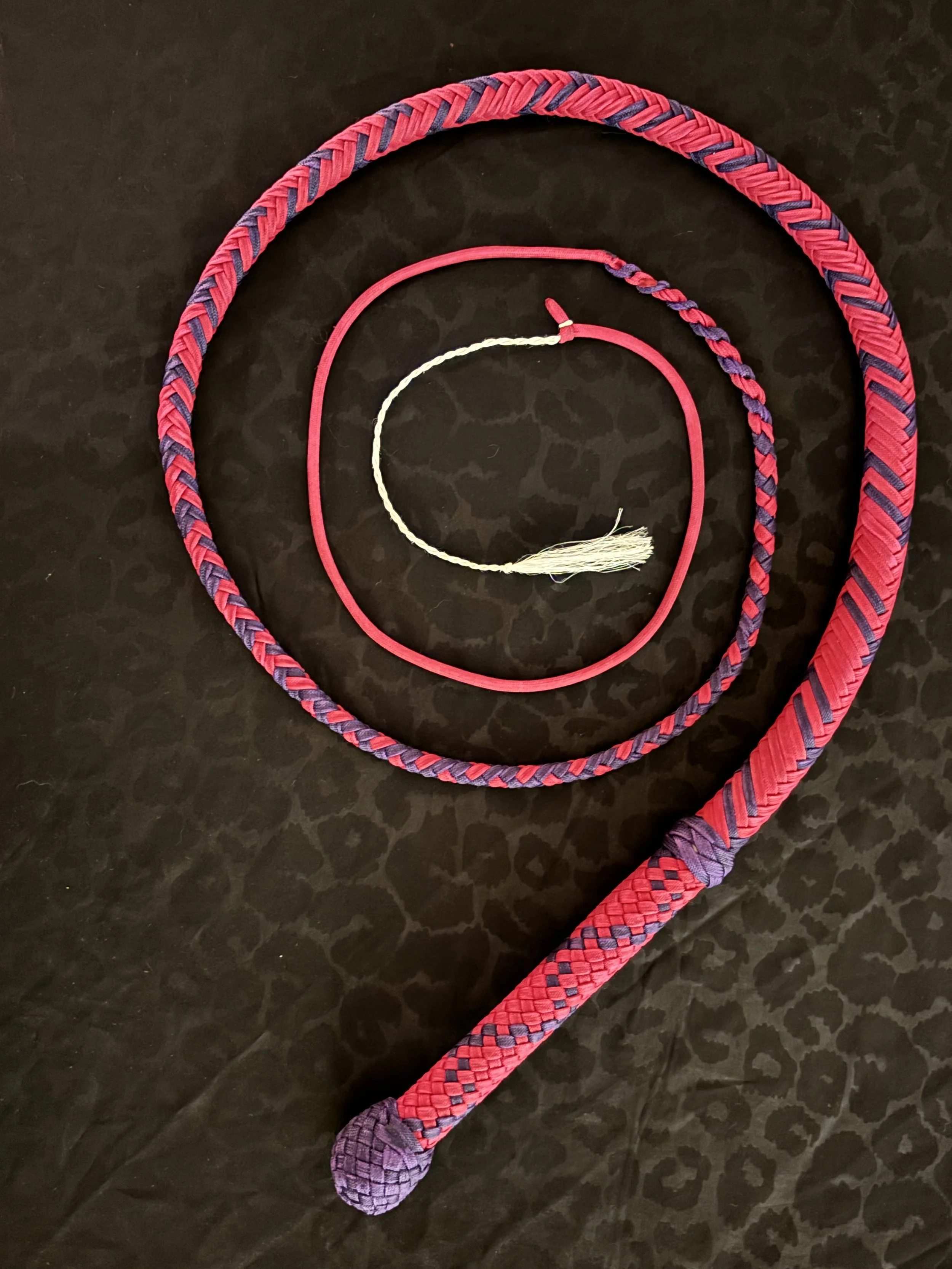 The Ombre’ style bullwhip is a custom design I've developed that features a smooth, gradual fade between colors that starts in the handle and continues along the length of the whip. The color transition can range from subtle to bold, depending on the desired aesthetic, making every Ombre’ whip a one-of-a-kind, functional work of art. A signature of the Sin City Kitty Style, this design is easily recognizable and well-regarded within the whip enthusiast community.