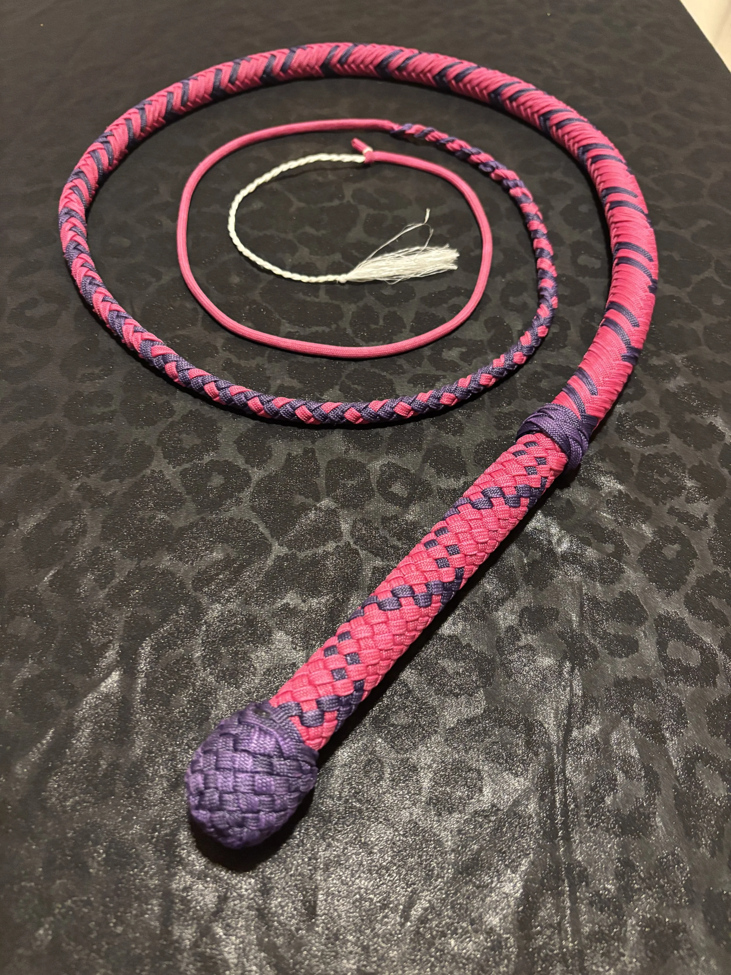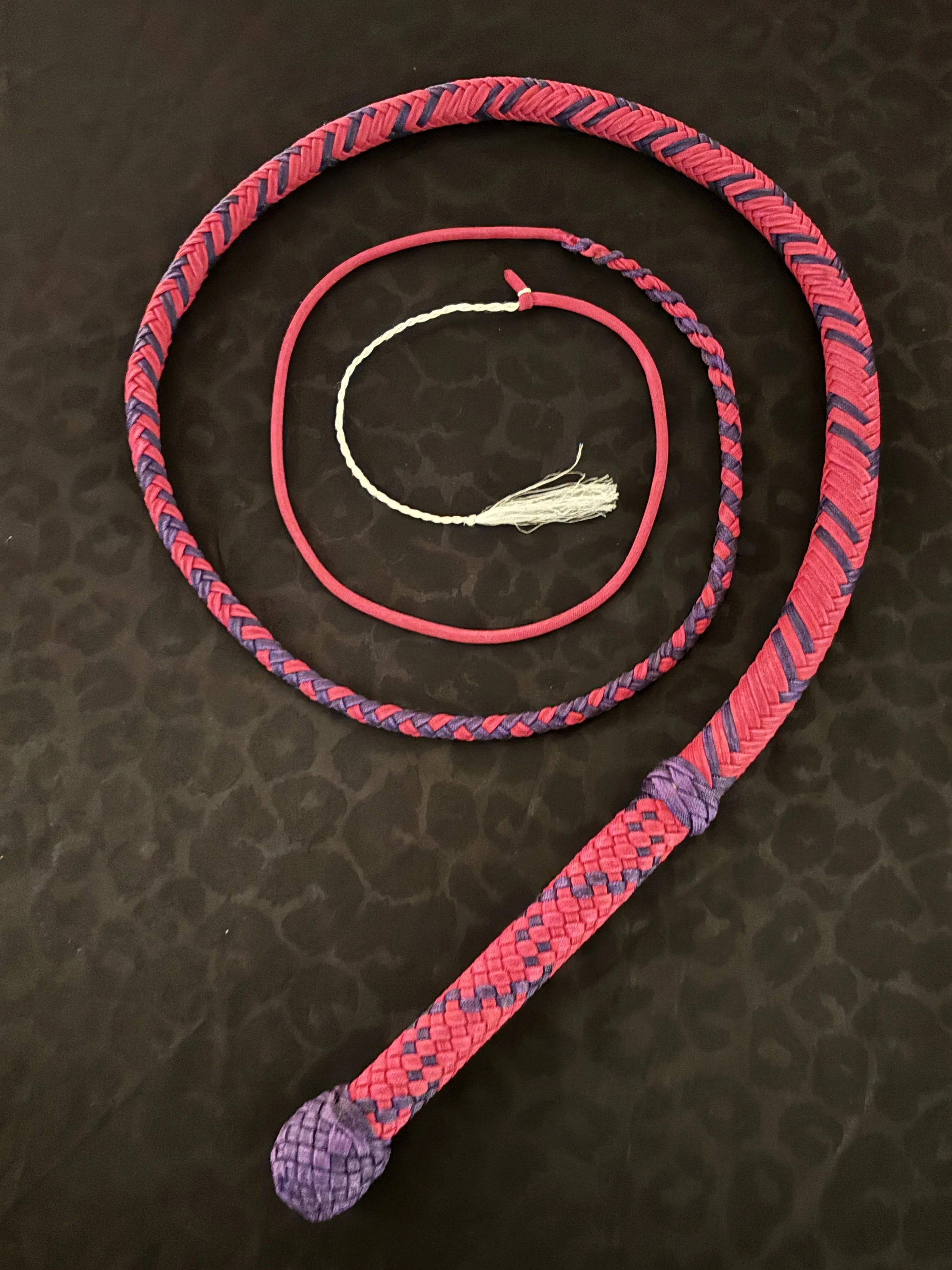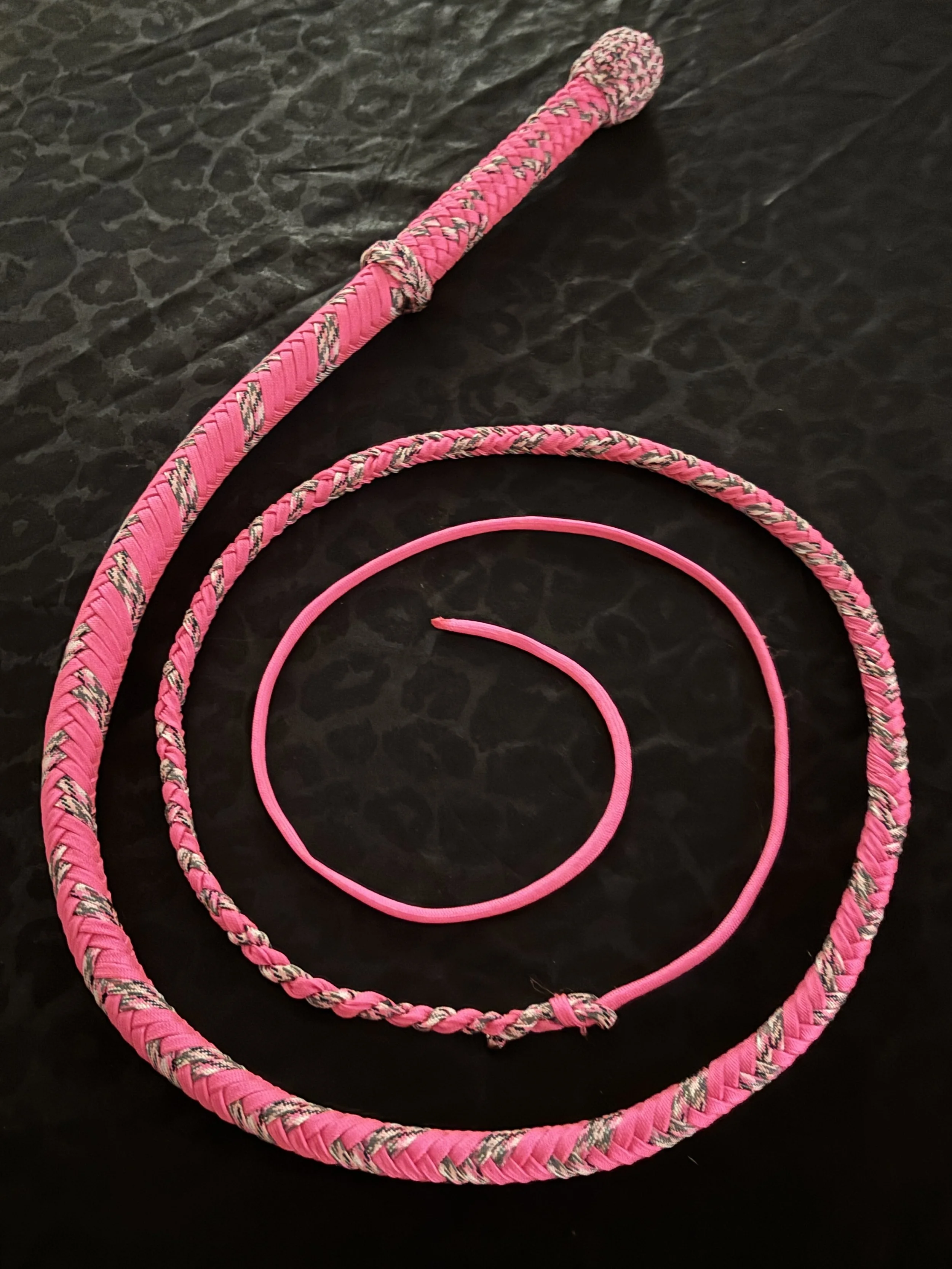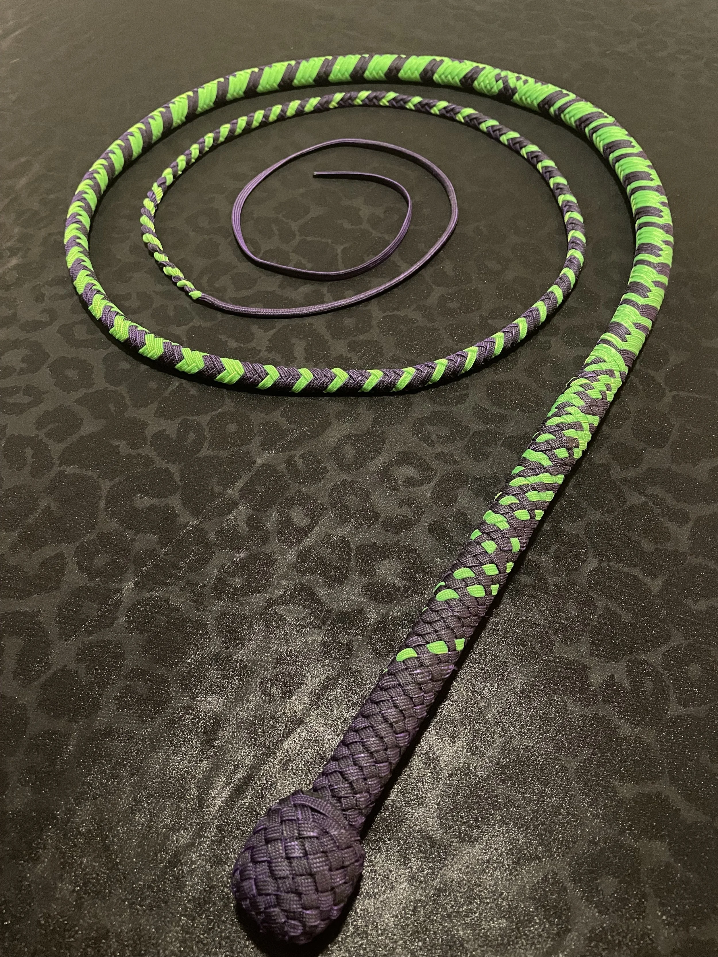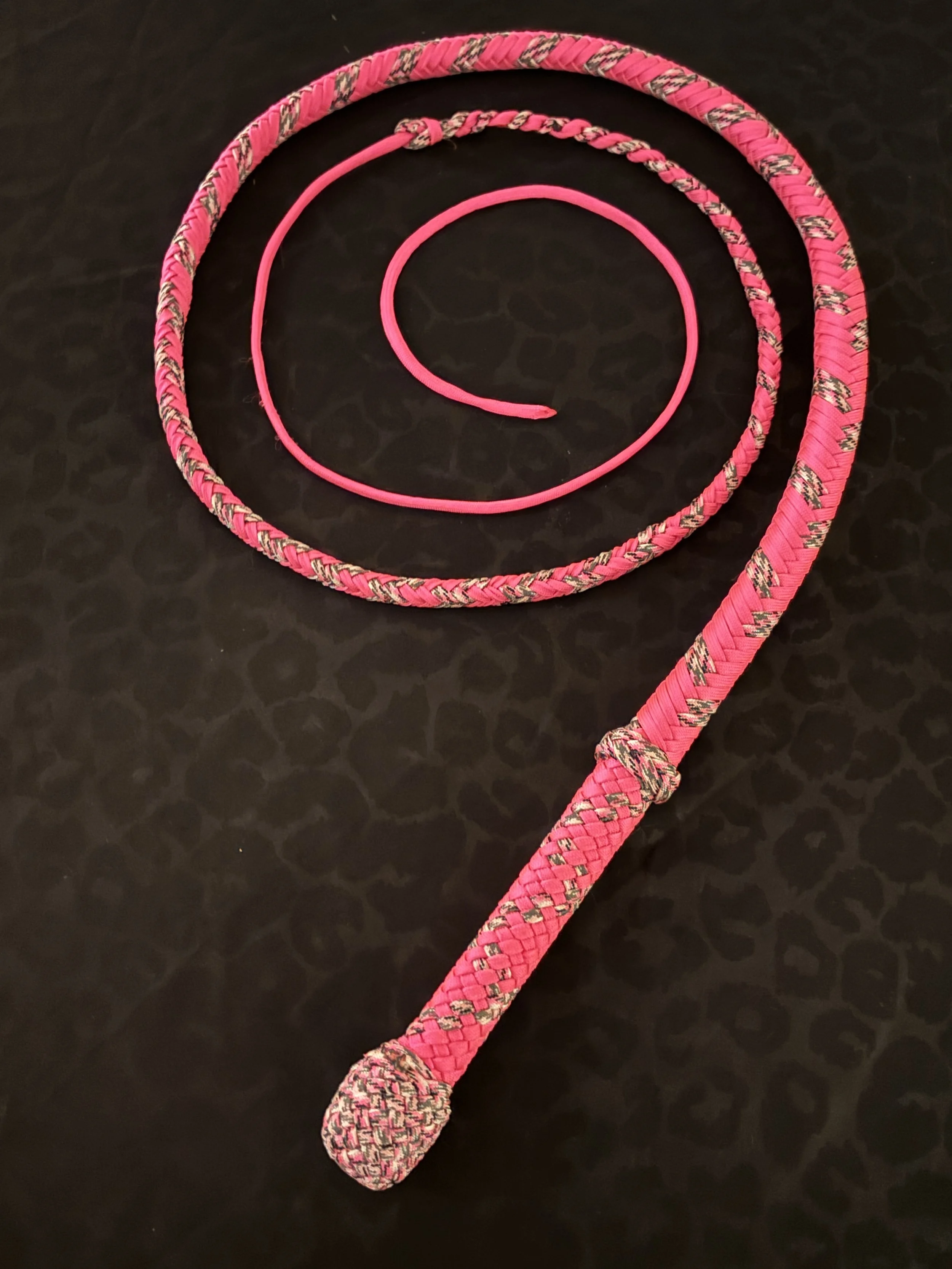 The Ombre’ style bullwhip is a custom design I've developed that features a smooth, gradual fade between colors that starts in the handle and continues along the length of the whip. The color transition can range from subtle to bold, depending on the desired aesthetic, making every Ombre’ whip a one-of-a-kind, functional work of art. A signature of the Sin City Kitty Style, this design is easily recognizable and well-regarded within the whip enthusiast community.