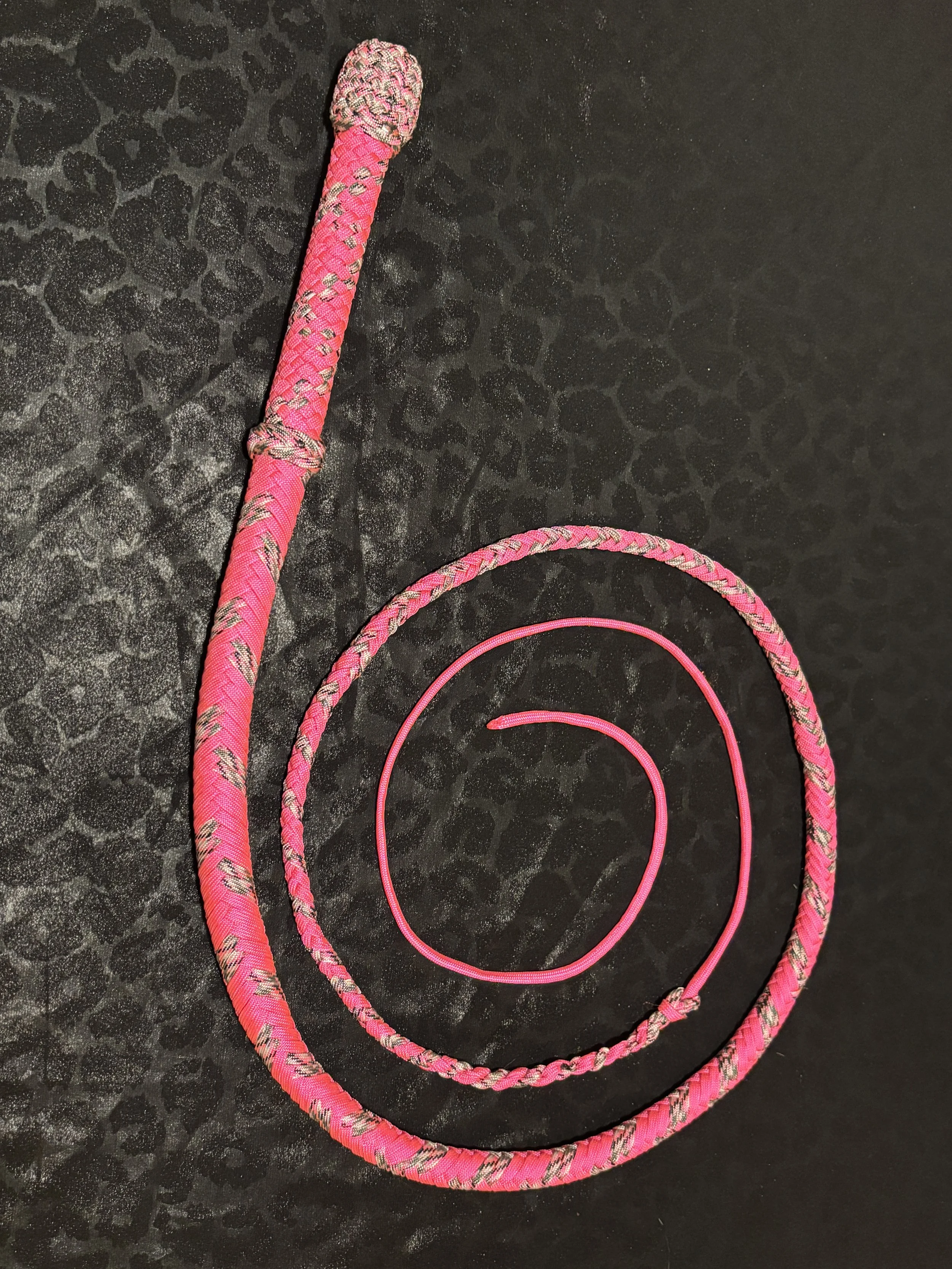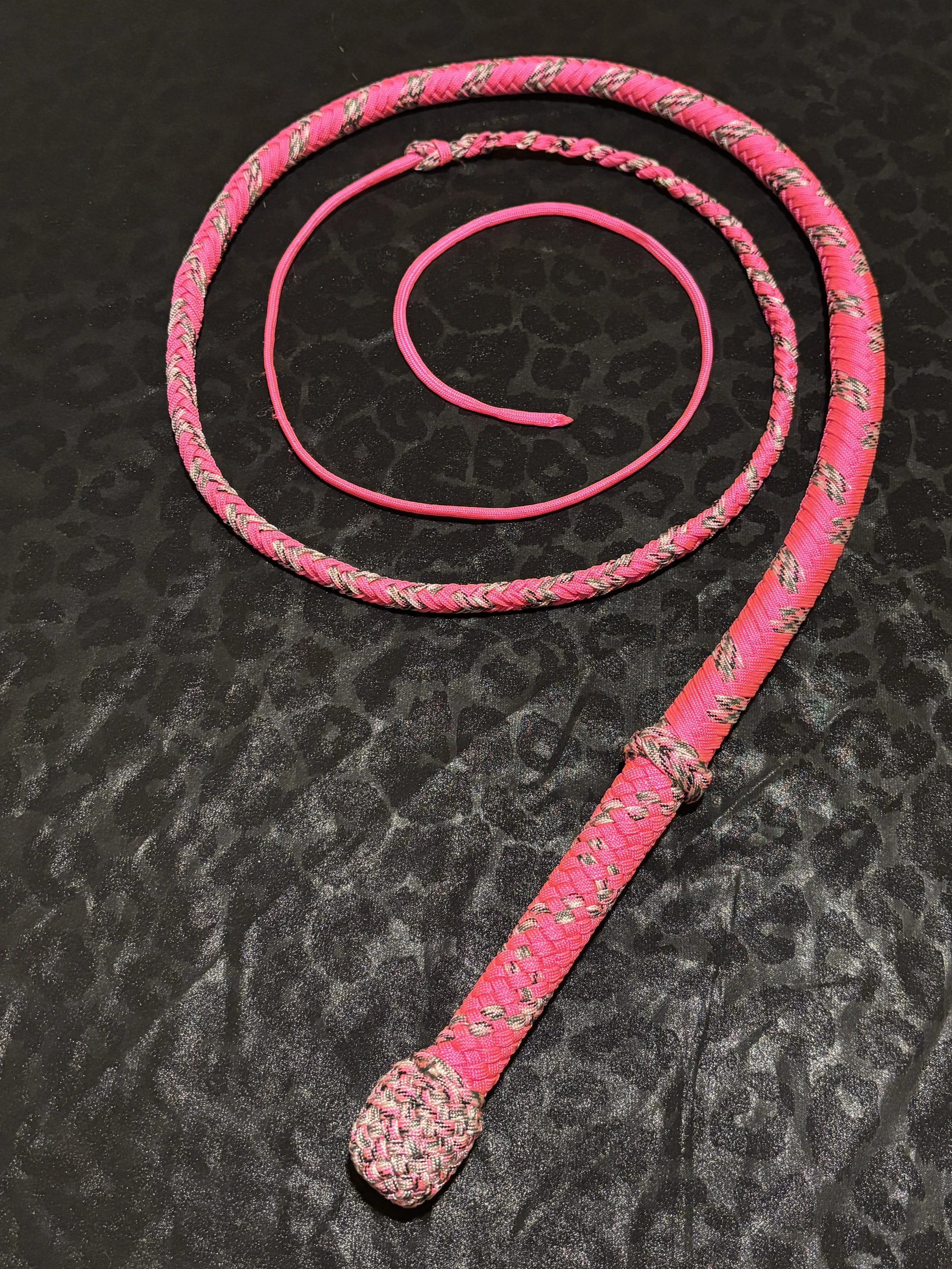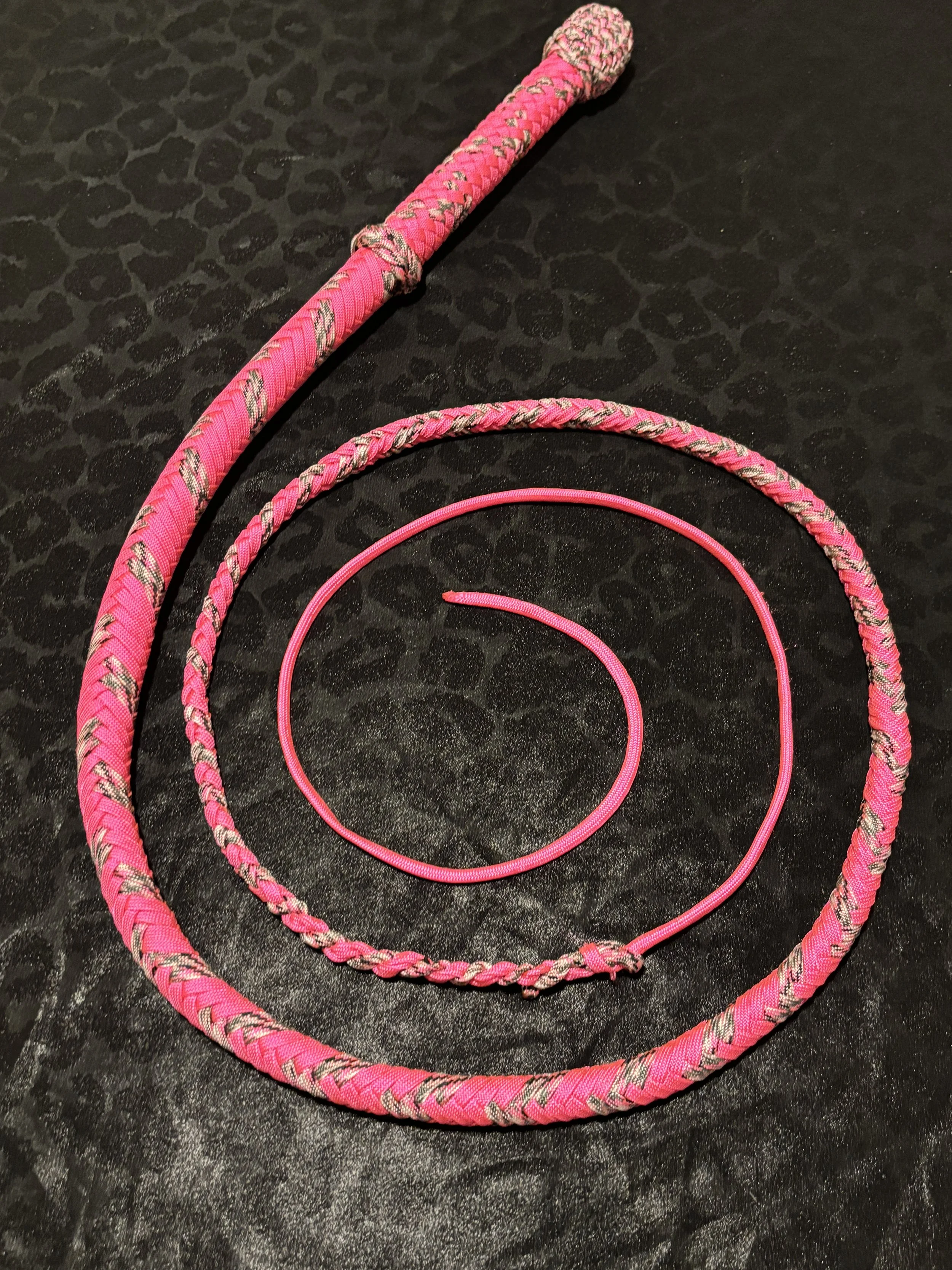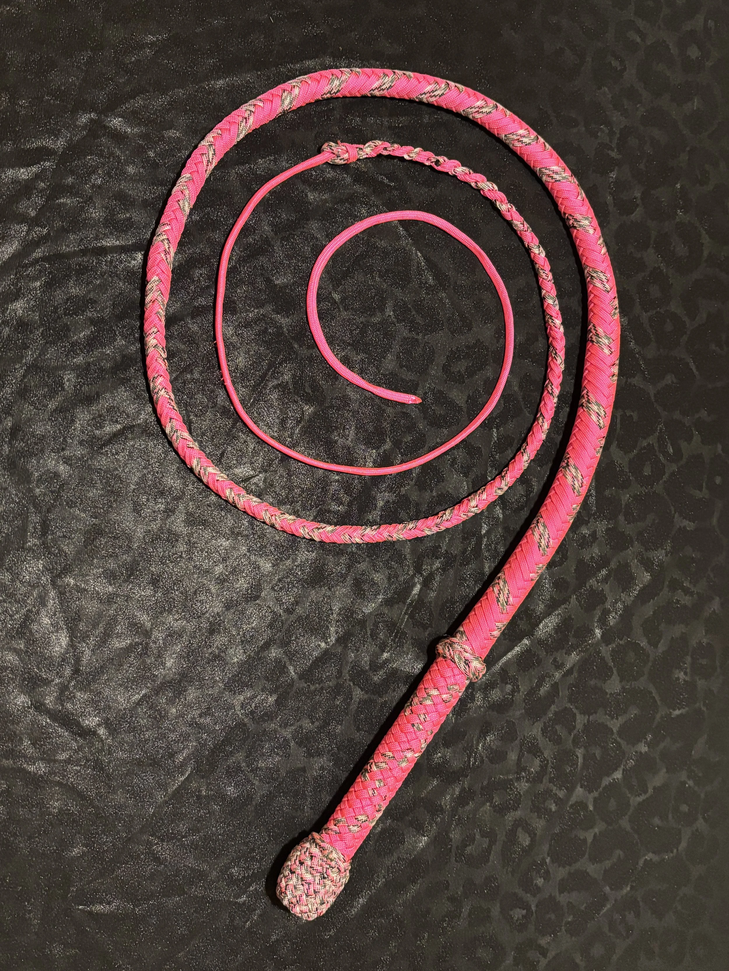 The Ombre’ style bullwhip is a custom design I've developed that features a smooth, gradual fade between colors that starts in the handle and continues along the length of the whip. The color transition can range from subtle to bold, depending on the desired aesthetic, making every Ombre’ whip a one-of-a-kind, functional work of art. A signature of the Sin City Kitty Style, this design is easily recognizable and well-regarded within the whip enthusiast community.