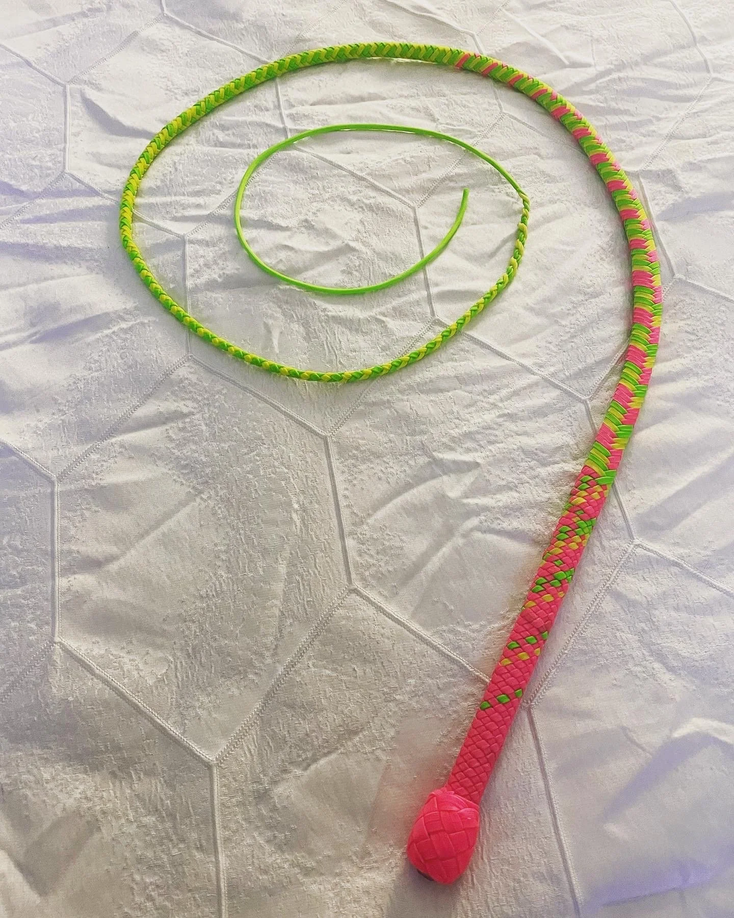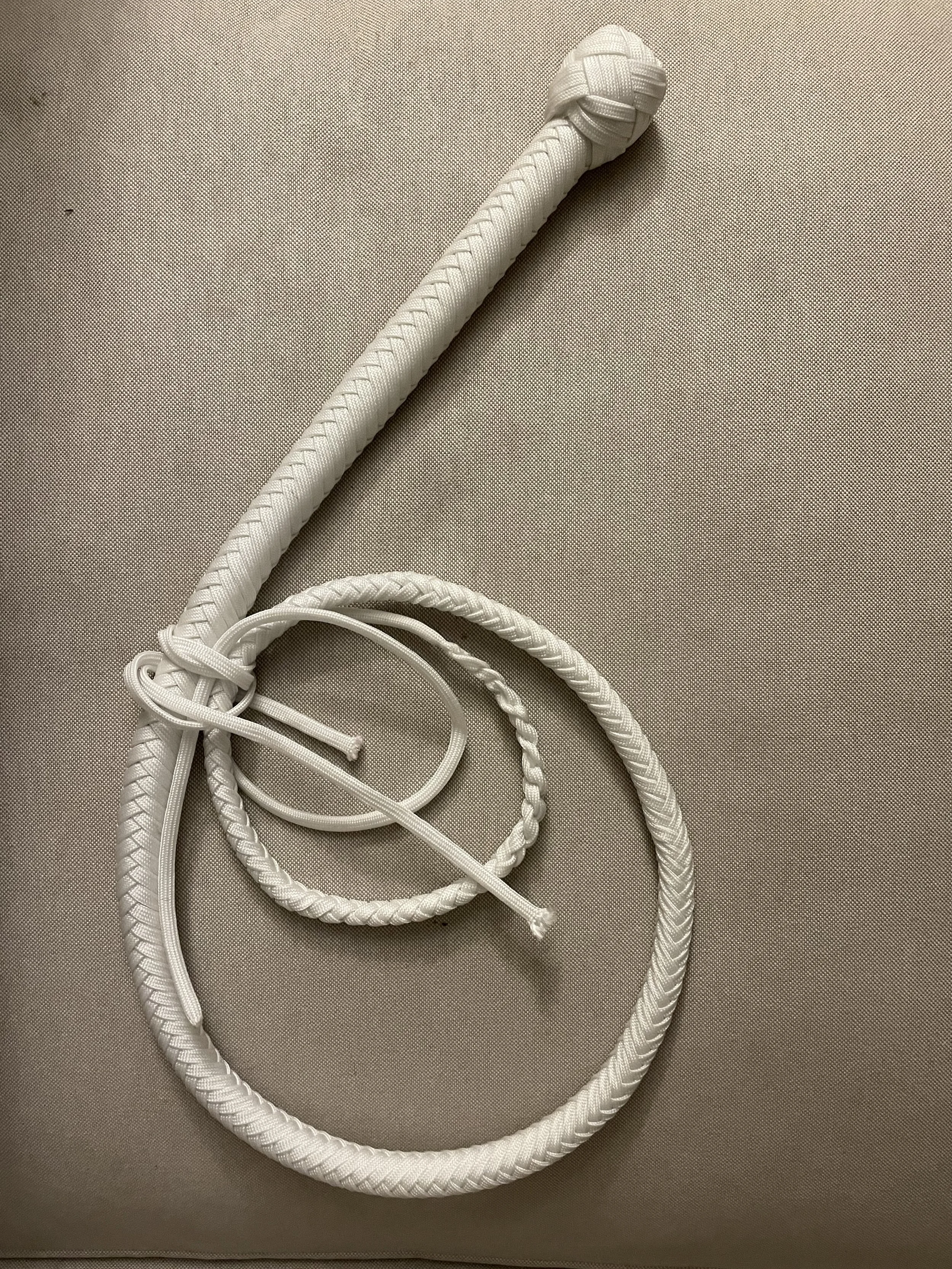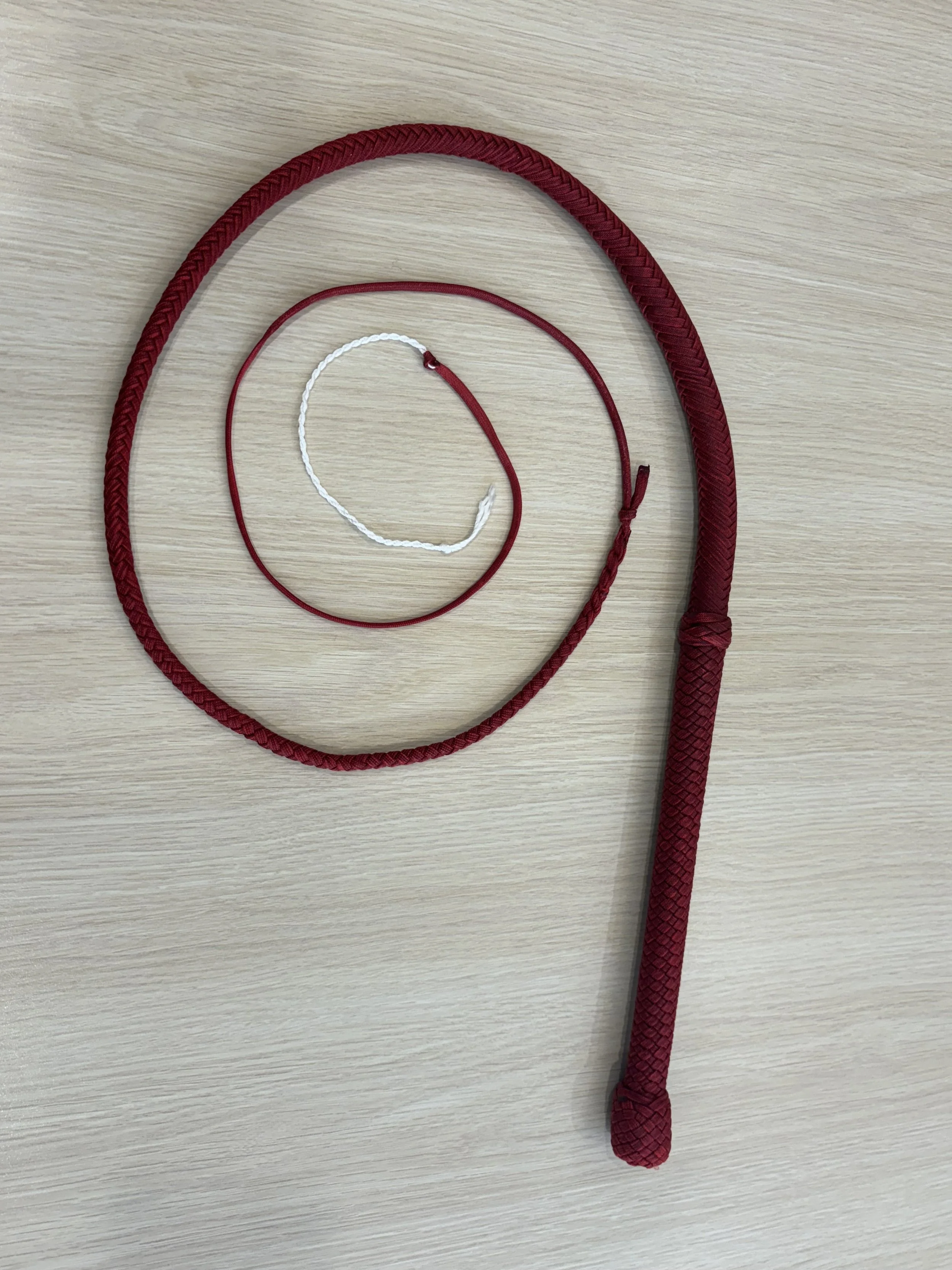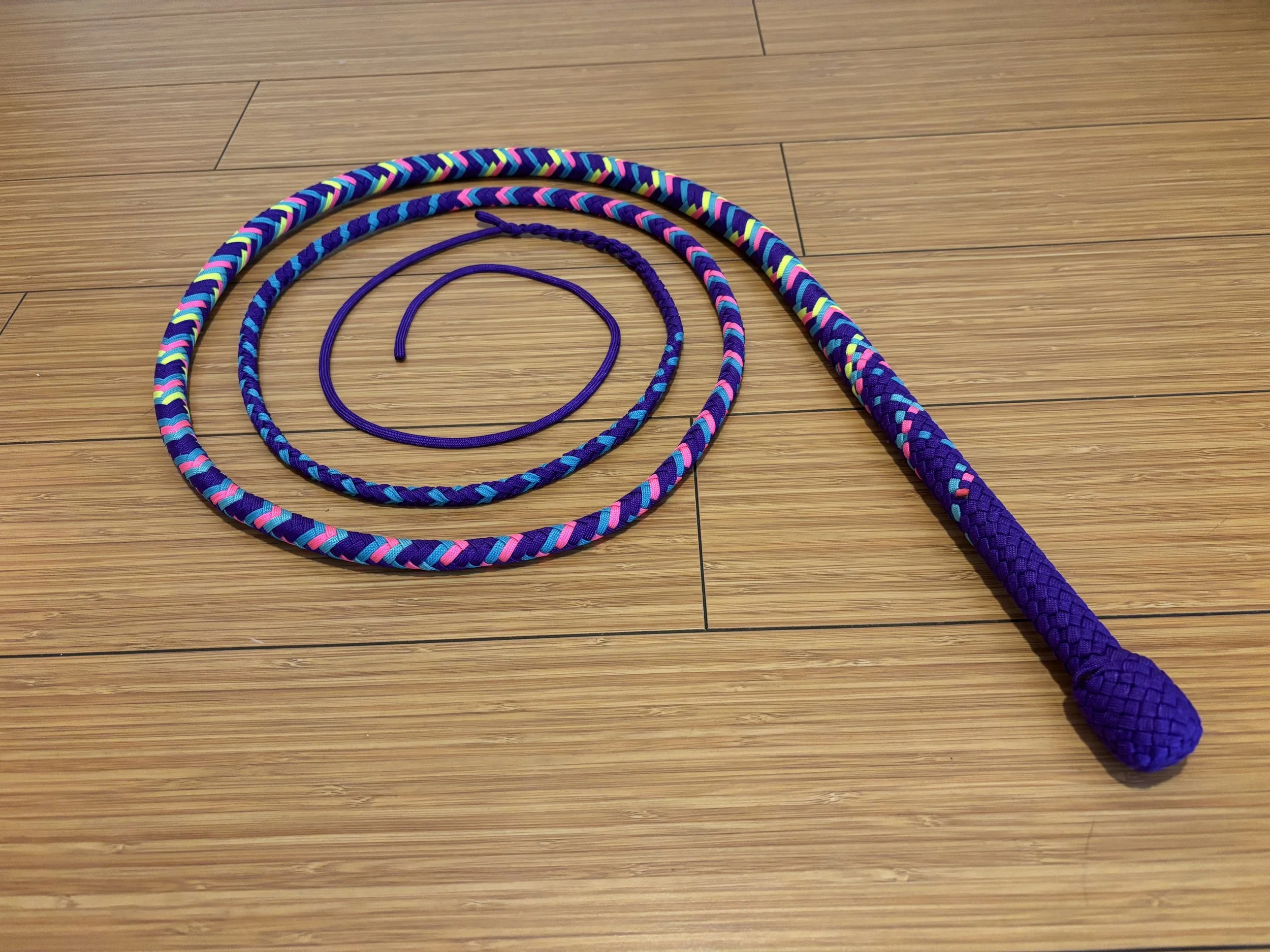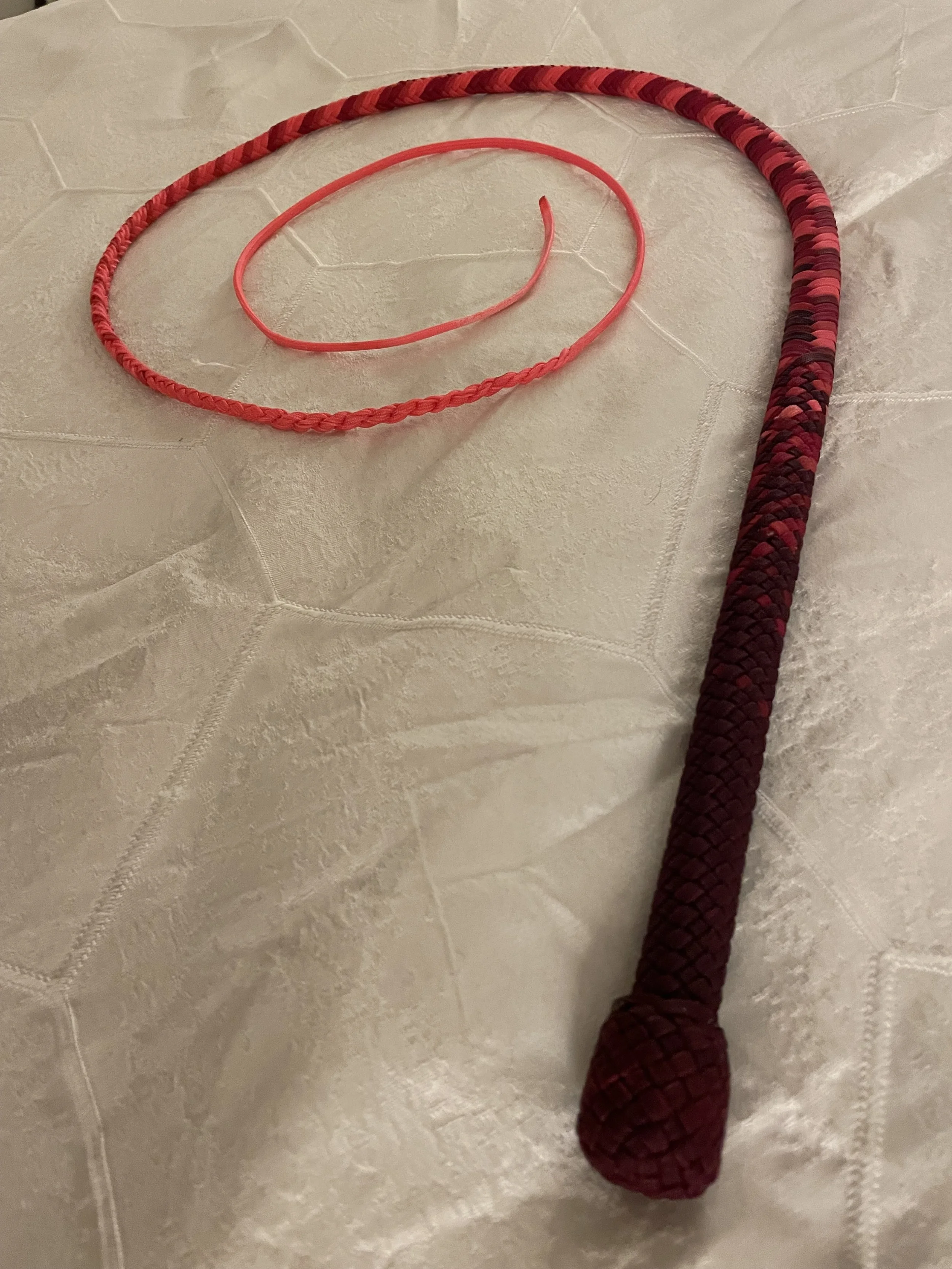 The Ombre’ style bullwhip is a custom design I've developed that features a smooth, gradual fade between colors that starts in the handle and continues along the length of the whip. The color transition can range from subtle to bold, depending on the desired aesthetic, making every Ombre’ whip a one-of-a-kind, functional work of art. A signature of the Sin City Kitty Style, this design is easily recognizable and well-regarded within the whip enthusiast community.